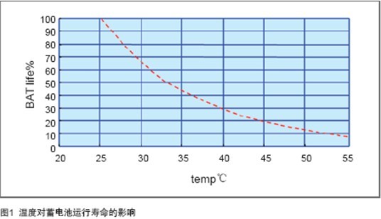 失水的途徑比較多:節(jié)流閥設(shè)計不合理,頻繁開啟;電源對蓄電池頻繁均充;環(huán)境溫度過高。其中高溫是最主要的因素,高溫會加速蓄電池失水速度,導(dǎo)致蓄電池容量下降。以25℃為基準,當蓄電池運行環(huán)境上升10℃,壽命減少50%,如圖1所示。