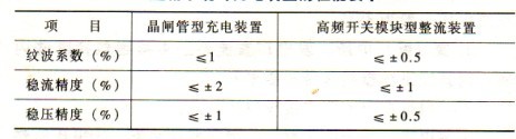 5)充電裝置是直接影響蓄電池運(yùn)行穩(wěn)定性和使用壽命的重要因素,要求充電裝置具有較好的波紋系數(shù)、穩(wěn)流系數(shù)和穩(wěn)壓系數(shù)。正常蓄電池為浮充狀態(tài),充電裝置輸出電壓略高于蓄電池端電壓,好的蓄電池有很平的外特性。如果充電裝置輸出電壓波紋系數(shù)高、電壓不穩(wěn),將影響直流負(fù)荷的正常運(yùn)行,尤其是目前廣泛采用了微機(jī)型保護(hù)和安全自動(dòng)裝置,影響更加嚴(yán)重。根據(jù)DL/T724--2000《發(fā)電廠變電所蓄電池直流電源裝置運(yùn)行與維護(hù)技術(shù)規(guī)程》要求,對(duì)充電裝置的要求見(jiàn)表2-1。