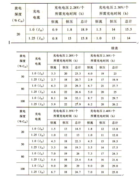 初充電一浮充電一均衡充電是按下列程序循環(huán)進(jìn)行的。在投運前,對電池進(jìn)行初充電,此時用恒流為l.Oll0進(jìn)行充電。當(dāng)單體電池電壓上升到2.35V轉(zhuǎn)為恒壓充電,此時充電流逐漸減少,然后轉(zhuǎn)為正常運行狀態(tài)即浮充電壓為2.25V。當(dāng)運行720h后,進(jìn)行均衡充電,即先以恒流l.Ollo電池充電,至電池電壓為2.35V轉(zhuǎn)為恒壓充電,電壓恒定一段時間又轉(zhuǎn)為正常浮充狀態(tài)。當(dāng)交流電源中斷后,此時自動 進(jìn)行均衡充電,以恒流l.Ol】o充電。電池電壓上升至2.35V后和上述運行初充后均衡充電的過程相同。上述兩階段充電,其浮充轉(zhuǎn)均充的判斷大多采用時間來整定,即不論放電幅度如何,一日由恒流階段轉(zhuǎn)入恒壓階段后,延時若干個小時,則自動轉(zhuǎn)為浮充。實際情況是充電所需時間與放電幅度有關(guān),如圖3-1所示。因此事故放電的深度是隨機的,若用一個固定的時間來操作,則有可能造成電池的過充或欠充,所以采用蓄電池回路的充電電流作為均充終期的判據(jù)是較合理的。不同放電深度后充電的所需時間見表3-1。表3-1 不同放電深度后充電所需時間