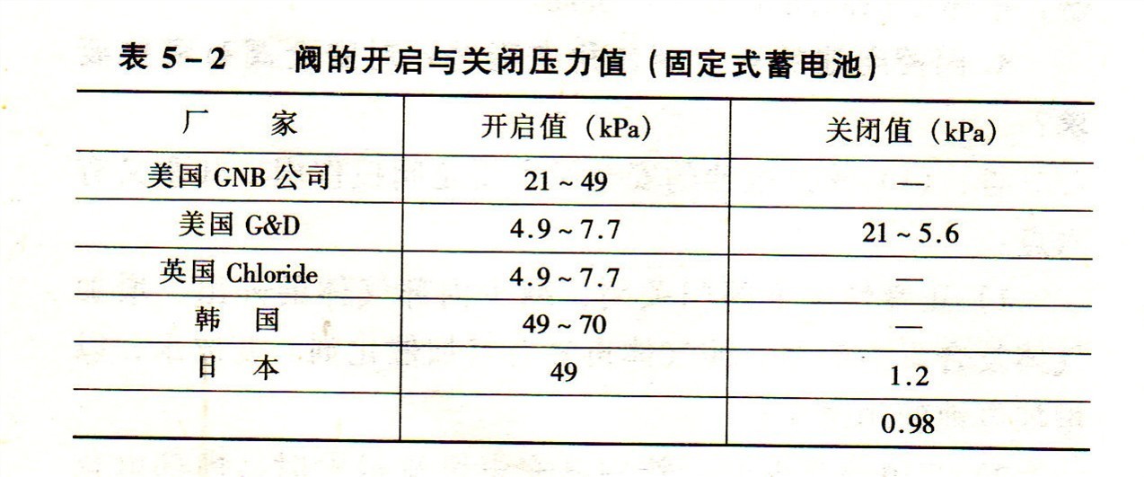 表5-2 閥的開(kāi)啟與關(guān)閉壓力值(固定式蓄電池)