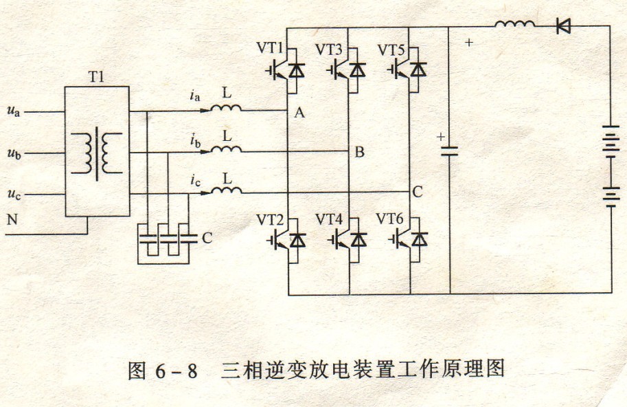 三相交流輸出,采用三相高頻PWM整流逆變電路,一方面控制蓄電池恒流放電,另一方面將蓄電池釋放的能量反饋回電網(wǎng),并控制流入電網(wǎng)的電流接近正弦波。